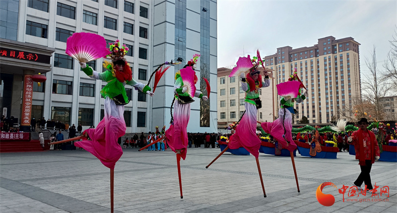 演出場上,雄獅、金龍、高蹺、春牛伴著春風舞動,太平鼓、嗩吶、銅鈸奏響新春旋律,生動再現(xiàn)了和政群眾蒸蒸日上的幸福生活。演員們扮相精致、身姿靈動,高蹺表演者彩扇輕搖、絲巾飛舞,盡顯民間藝術的獨特韻味。